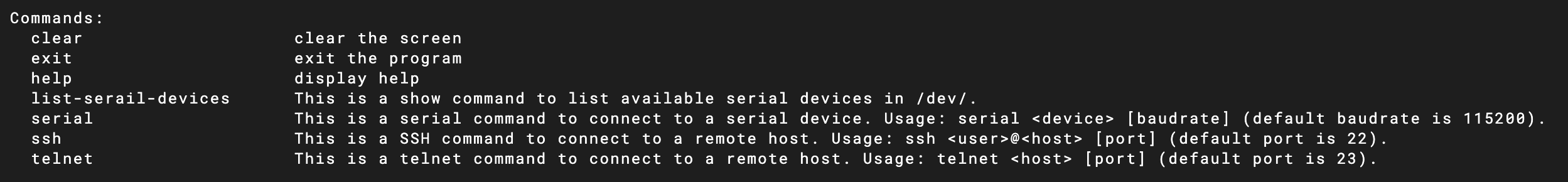 To exit the serial connection interface, press the key combination Ctrl + J ,This will return you to the host terminal prompt.